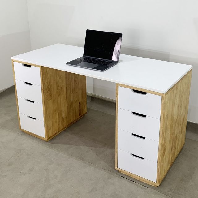 Bàn ikea gỗ cao su cao cấp140x60cm gỗ cao su BD68050 là mẫu bàn rất tiện lợi với 2 chân là hệ tủ hộc kéo 4 ngăn cao 73cm rất tiện lợi vói chiều ngang tủ 35cm với chất liệu gỗ cao su tiêu chuẩn AA dày 17mm sơn PU ưu việt, mặt bàn kích thước 60x140cm sơn Pu trắng đẹp mắt kết hợp với 2 chân tủ cửa hộc kéo trắng là điểm nhấn cho sản phẩm