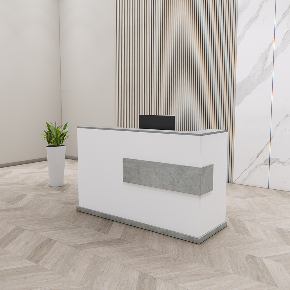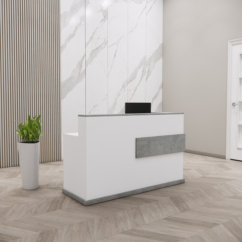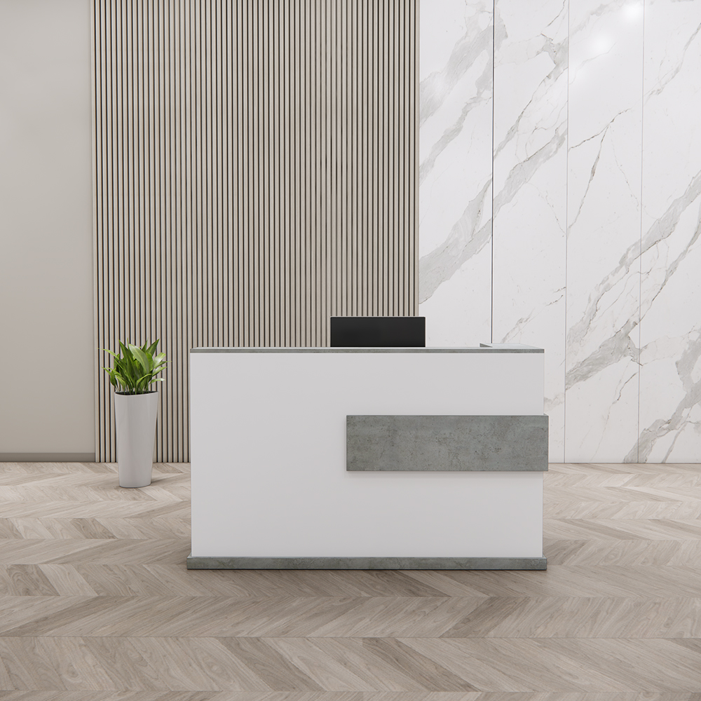 Quầy lễ tân QLT0042 gây ấn tượng với kiểu dáng vuông vắn, đường nét mạnh mẽ và màu sắc trung tính – phù hợp với mọi phong cách thiết kế từ hiện đại đến công nghiệp. Phần mặt ốp nổi với hiệu ứng giả bê tông tạo điểm nhấn khác biệt nhưng không kém phần tinh tế.