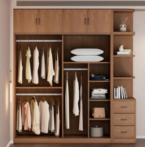 Với thiết kế thông minh, tủ được chia thành hai khoang lớn, cùng với một khoang trên có bốn cánh mở giúp tối ưu hóa không gian lưu trữ. Cụ thể, khoang bên trái của tủ được trang bị một đợt cố định và hai suốt treo quần áo, cho phép người dùng dễ dàng sắp xếp và treo các loại trang phục khác nhau. Trong khi đó, khoang bên phải bao gồm một suốt treo nhỏ, một ngăn kéo tiện lợi và các đợt chia khoang, giúp việc tổ chức đồ đạc trở nên dễ dàng hơn.