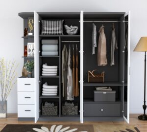 Sự kết hợp tinh tế giữa tủ quần áo 4 cánh mở và kệ góc trang trí, TQA13 không chỉ đáp ứng nhu cầu lưu trữ mà còn tạo điểm nhấn thẩm mỹ nổi bật cho không gian phòng ngủ hiện đại.