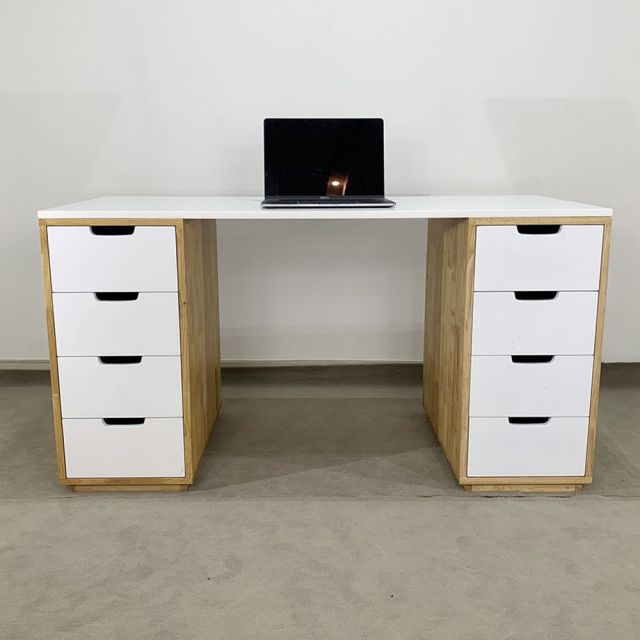 Bàn ikea gỗ cao su cao cấp140x60cm gỗ cao su BD68050 là mẫu bàn rất tiện lợi với 2 chân là hệ tủ hộc kéo 4 ngăn cao 73cm rất tiện lợi vói chiều ngang tủ 35cm với chất liệu gỗ cao su tiêu chuẩn AA dày 17mm sơn PU ưu việt, mặt bàn kích thước 60x140cm sơn Pu trắng đẹp mắt kết hợp với 2 chân tủ cửa hộc kéo trắng là điểm nhấn cho sản phẩm