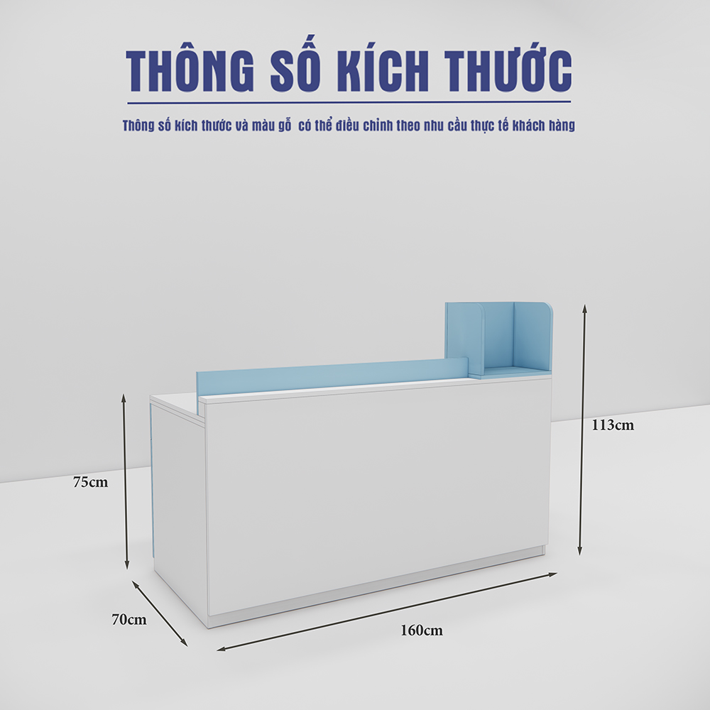 Kích thước tiêu chuẩn: Dài 160cm x Rộng 70cm x Cao tổng thể 113cm (Chiều cao mặt bàn: 75cm)