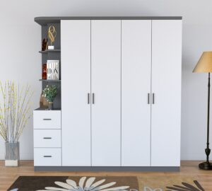 Sự kết hợp tinh tế giữa tủ quần áo 4 cánh mở và kệ góc trang trí, TQA13 không chỉ đáp ứng nhu cầu lưu trữ mà còn tạo điểm nhấn thẩm mỹ nổi bật cho không gian phòng ngủ hiện đại.